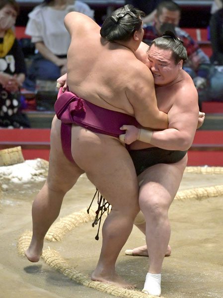 初日から12連勝だけど…(寄り切りで御嶽海を下す白鵬)/(C)共同通信社