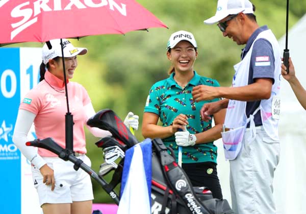 同組の小祝さくら(左)と談笑する渋野(C)日刊ゲンダイ