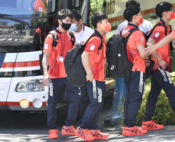 日本代表も次々と入村(体操男子の内村航平=左端)/(C)日刊ゲンダイ