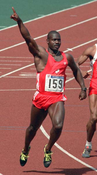 1988年ソウル五輪、ルイスとの「世紀のレース」に決着をつけ、「ナンバーワン」の右手を高く突き挙げるベン・ジョンソンだったが…(C)共同通信社