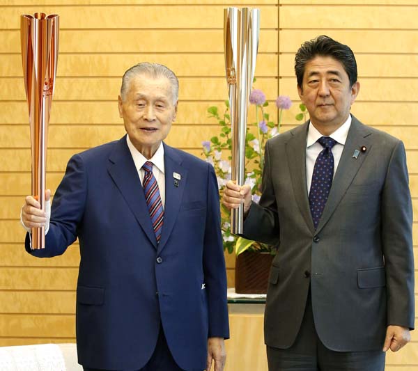 東京五輪のトーチを手に、森喜朗前組織委会長(左)と安倍前首相(C)共同通信社