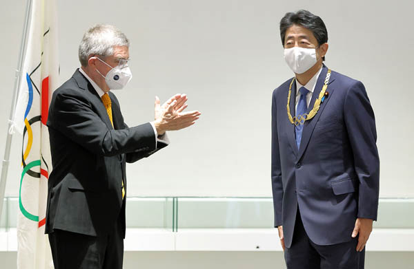 さんざん“安倍の五輪”を主張してきて責任逃れ(IOCのバッハ会長から「五輪オーダー」を受章する安倍前首相=代表取材)