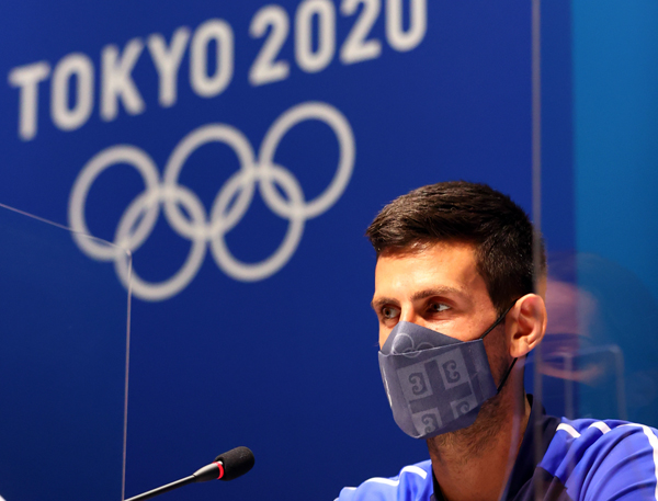 東京五輪で記者会見するテニス男子シングルスのジョコビッチ選手(C)ロイター