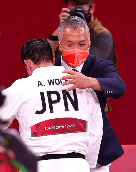 金メダル獲得のウルフアロンをねぎらう鈴木桂治氏(C)JMPA
