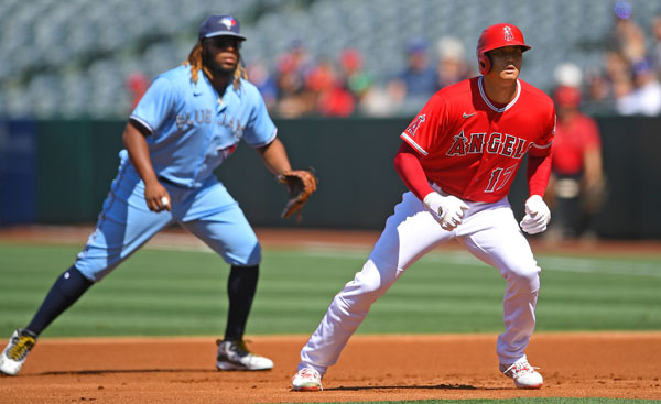 一回の出塁時にゲレーロJr.(左)と並ぶ大谷(C)ロイター/USA TODAY Sports