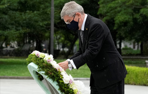 8月6日、広島原爆投下の日に選手の黙祷を要望しても一蹴したのに…(広島原爆ドームを訪問したIOCのバッハ会長)/(C)ロイター