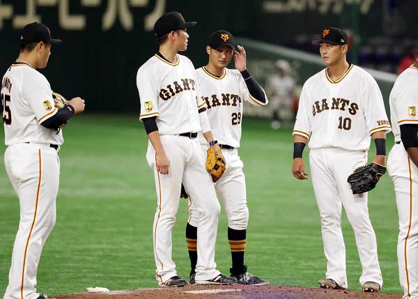 マウンドに集まる左から岡本、坂本、吉川、中田(C)日刊ゲンダイ