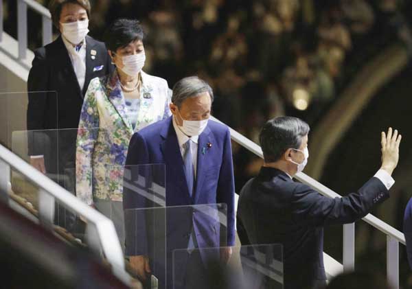 パラリンピック開会式(手前から天皇陛下、菅首相、小池都知事、橋本組織委会長)/(C)日刊ゲンダイ