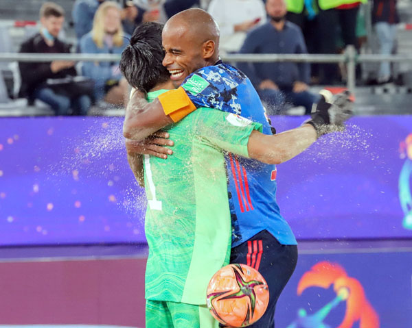 最終盤のピンチを切り抜けたGK河合を祝福するFPオズ(写真)Chikako SHINOHARA
