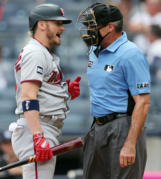 ヘルナンデス審判員(右)の“ストライク・アウト”判定について言い合うツインズのドナルドソン(C)ロイター/USA TODAY Sports