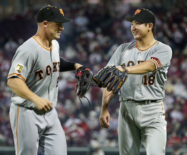 七回を投げ終え、ハイネマン(左)とタッチする菅野(C)共同通信社