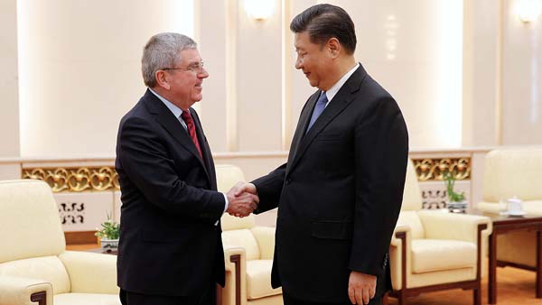 習近平中国国家主席(右)とIOCバッハ会長、北京五輪成功に向けがっちり握手(C)ロイター
