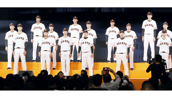 昨2020年の新入団選手と原監督(前列央)、阿部二軍監督(同右端)/(C)共同通信社