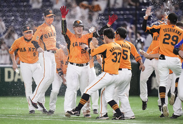 サヨナラ犠飛を放った岡本(左3)と喜ぶ巨人ナイン(C)共同通信社