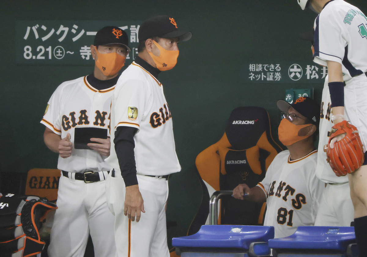 ベンチで原監督(央)と話す宮本コーチ(右)と桑田補佐(C)日刊ゲンダイ