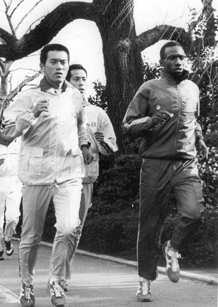 瀬古(左)と神宮外苑でトレーニングするダグラス・ワキウリ(C)共同通信社