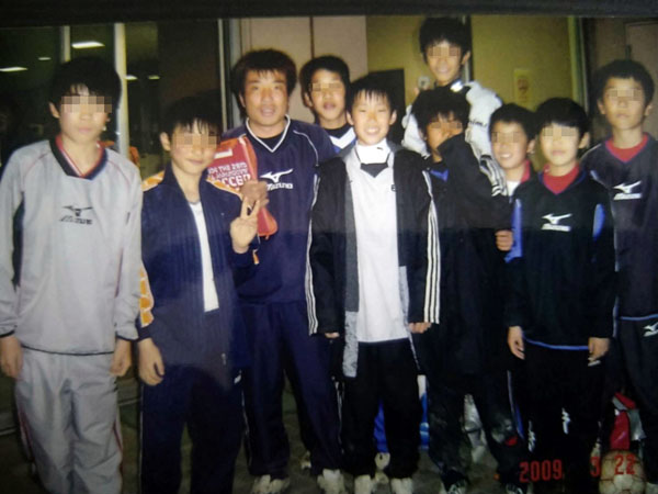 キッズFCの飯尾監督(左3)と鎌田(中央)/(提供写真)