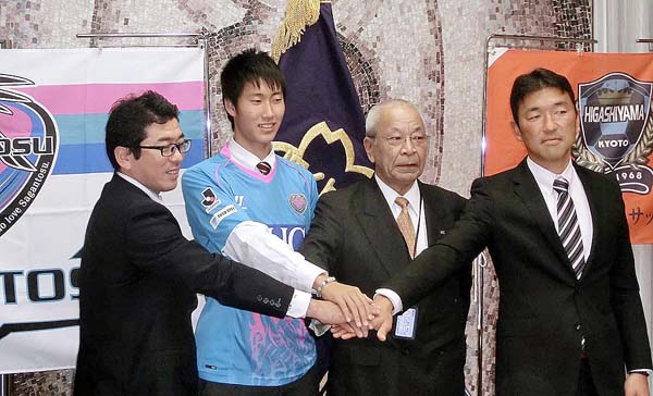 東山高で鳥栖の入団発表(左から鳥栖・永井強化部長、鎌田、東山高・奥田学校長、東山高サッカー部・福重監督)/(提供写真)