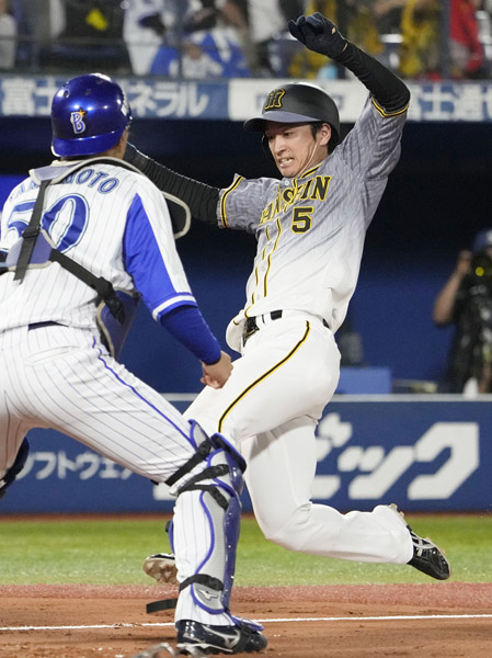 マルテの二塁打で先制のホーム踏んだ近本は絶好調(C)共同通信社