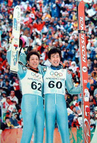 長野五輪スキージャンプで団体金メダルを獲得した原田雅彦=右(左は船木和喜)/(C)JMPA