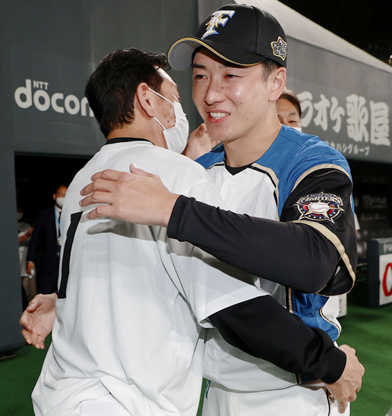 試合後、場内を一周した斎藤(右)と抱き合う栗山監督(球団提供)