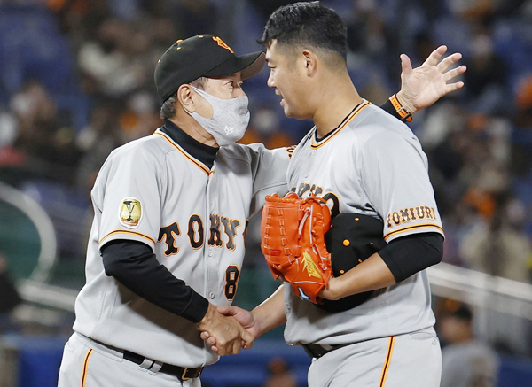 八回に現役最後の登板を終えた大竹をねぎらう原監督(C)共同通信社