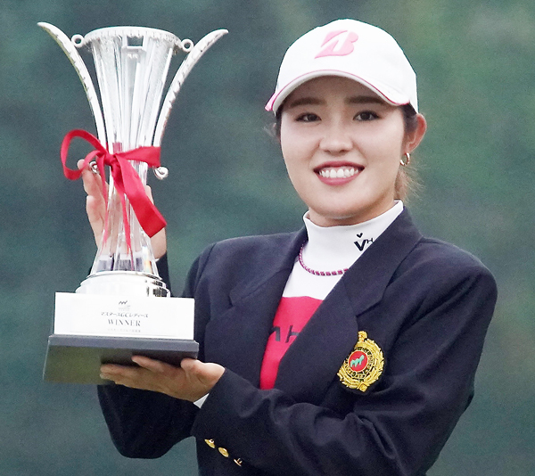 優勝トロフィーを掲げ笑顔の古江(C)日刊ゲンダイ