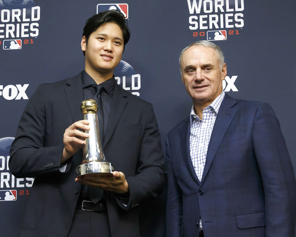 米大リーグのコミッショナー特別表彰を受けたエンゼルスの大谷(右は、マンフレッド・コミッショナー)/(C)共同通信社