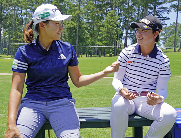 6月の全米女子プロの練習日に談笑する渋野(左)と笹生の2人(C)共同通信社