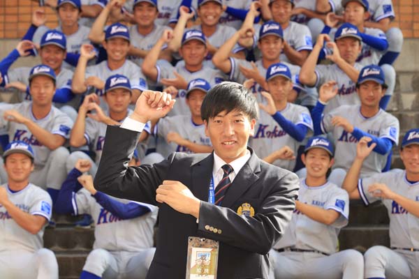 先月、巨人から指名あいさつを受けた際に。関西国際大ナインと翁田大勢投手(C)共同通信社