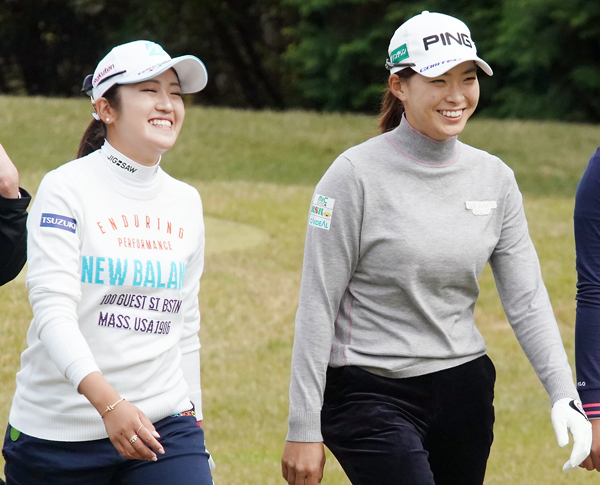 ラウンド中、渋野(右)と談笑する稲見(C)日刊ゲンダイ