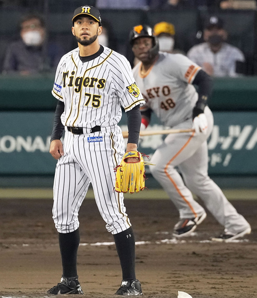 八回巨人1死二、三塁、ウィーラー(奥)に中犠飛を許した阪神・スアレス(C)共同通信社