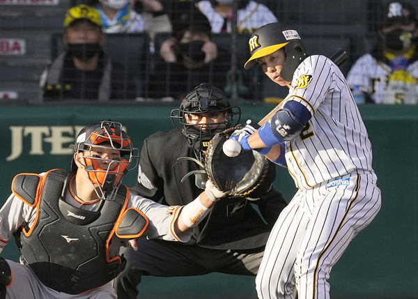 五回阪神2死二塁、グリップエンドに投球が当たり、捕ゴロに倒れる梅野(捕手大城)/(C)共同通信社