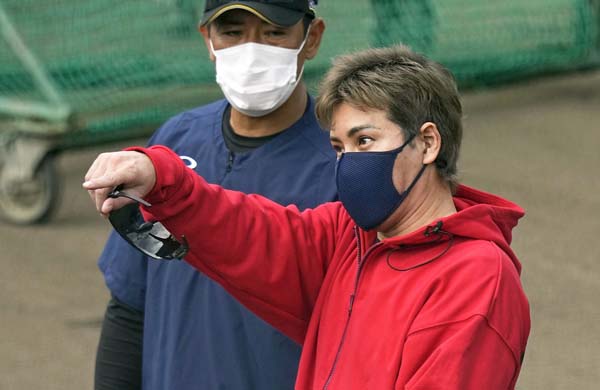 稲葉GM(奥)とは、現役時代からツーカーの間柄の新庄監督(C)共同通信社
