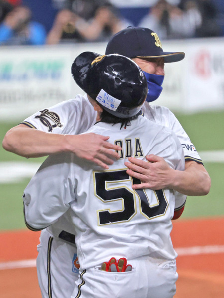 殊勲打の小田と抱き合う中嶋監督(C)日刊ゲンダイ