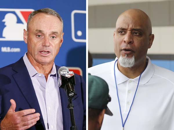 米大リーグ機構のマンフレッド・コミッショナー(左)と大リーグ選手会のクラーク専務理事(C)共同通信社