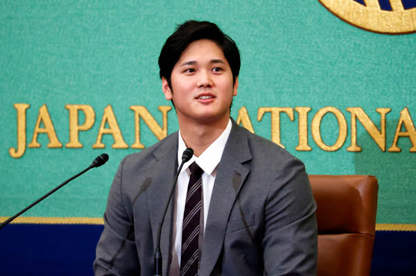 15日午前、日本記者クラブで会見に臨むエンゼルスの大谷(C)ロイター