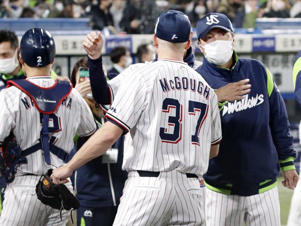 選手が力を発揮する環境をつくった高津監督(右)/(C)共同通信社