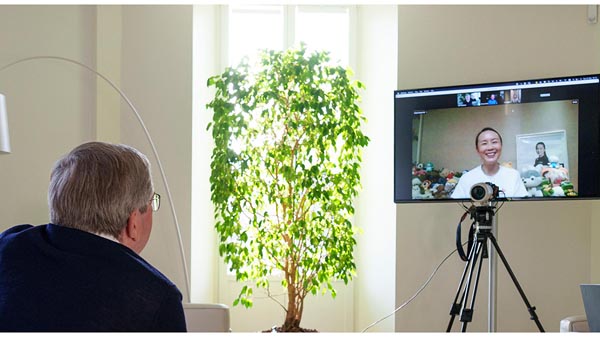 中国の女子プロテニス選手の彰帥さんとテレビ電話で話すIOCのトーマス・バッハ会長(C)ロイター/EYEPRESS Images