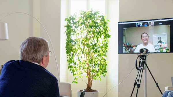 テレビ電話で彭帥さんと会話を交わすIOCのバッハ会長(C)IOC/Greg Martin