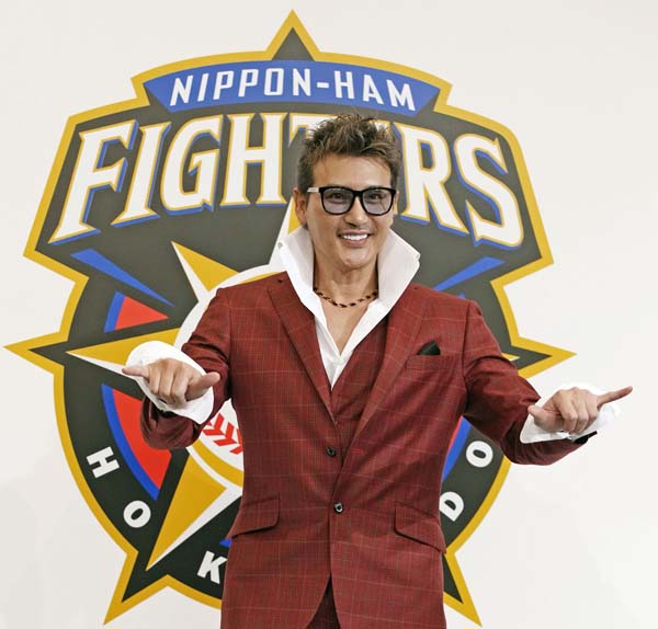 クリムゾンレッドのスーツで就任会見を行った新庄監督(C)共同通信社