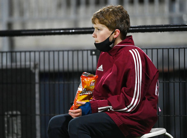 試合中に空腹に負けてマスクをずらしてスナック菓子を食べるボールボーイ/(写真)早草紀子