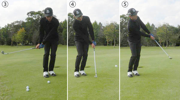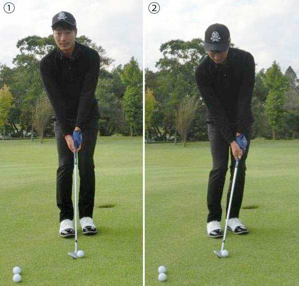 ボール位置センター、左足体重、ハンドファーストが基本3点セット(写真①→②)/(C)日刊ゲンダイ