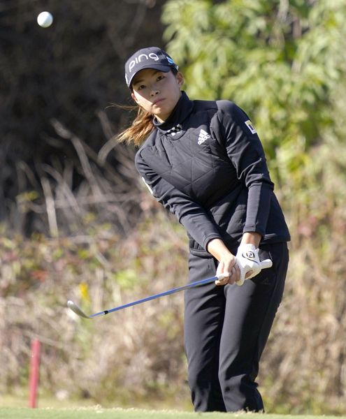 最終18番でショットを放つ渋野(C)共同通信社