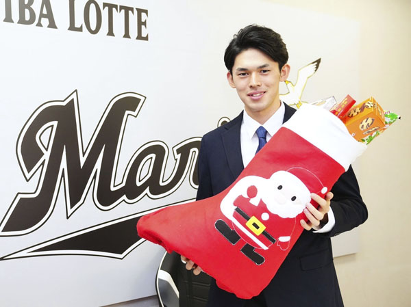 菓子を手に笑顔を見せる佐々木朗希(C)共同通信社