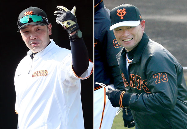阿部作戦兼ディフェンスチーフコーチ(左)と桑田投手チーフコーチ(C)日刊ゲンダイ