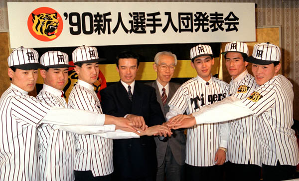 入団発表での新庄(左端)と吉田浩氏(右端)/(C)共同通信社