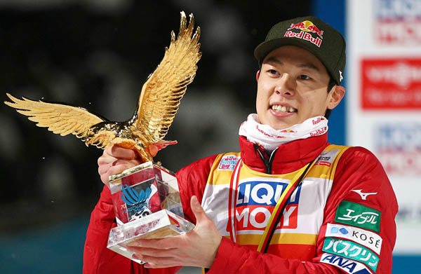 ゴールデンイーグルを手に撮影に応じる小林陵(C)ロイター