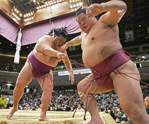 強敵・大栄翔に粘り勝ちの御嶽海(C)共同通信社