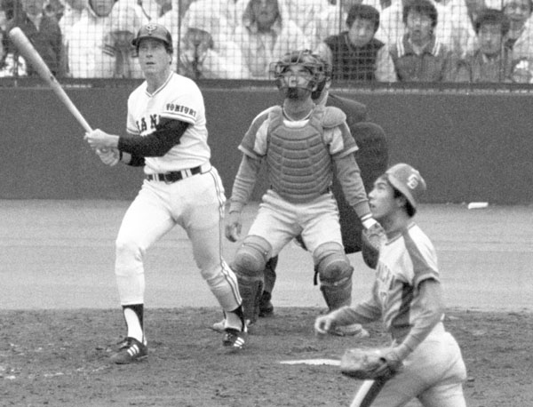 1981年4月4日の開幕戦で巨人のトマソン(左)に本塁打を打たれる牛島(右)。捕手はデビュー戦の新人時代の筆者(C)共同通信社